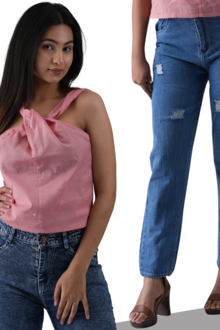 Flex Pink Halter Neck Top with Dark Blue Relax Fit Women’s Jeans