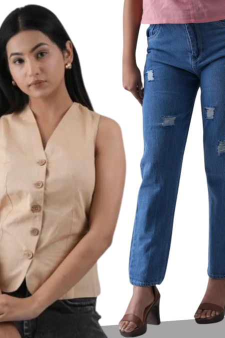 Ivory Sleeveless Waistcoat with Dark Blue Relax Fit Women’s Jeans