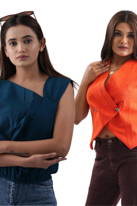 Marigold Overlay Waistcoat and Royal Blue One-Shoulder Top